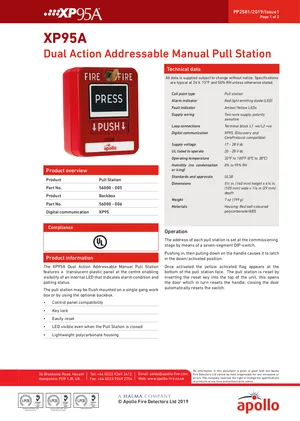 Datasheet for the Apollo 56000-005, published in 2019. Document No: PP2581/2019/Issue1, Rev: Issue1. Models XP95A, 56000-005 and 56000-006. Engineering specifications, wiring diagrams, and mounting dimensions.