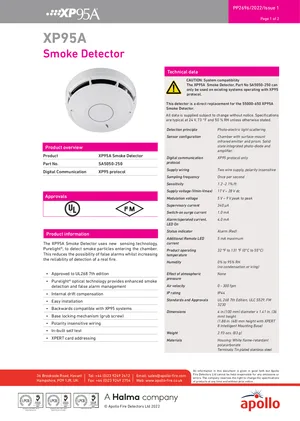 Datasheet for the Apollo SA5050-250, published in 2022. Document No: PP2696/2022/Issue 1, Rev: Issue 1. 11 models including XP95A, SA5050-250, 55000-650 and 8 additional variants. Product features, environmental operating limits, and compatibility data.