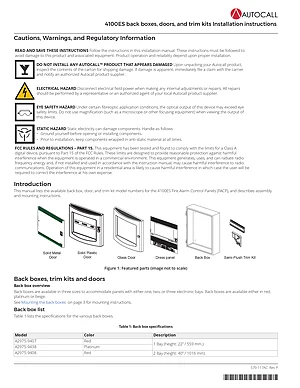 Installation Manual for the Autocall 4100ES Back Boxes, Doors, and Trim Kits, published in 2018. Document No: 579-117AC, Rev: P. 33 models including A2975-9407, A2975-9438, A2975-9408 and 30 additional variants. Hardware installation, terminal connections, and environmental requirements.