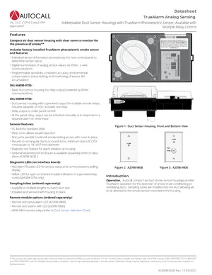 Datasheet for the Autocall Addressable Duct Sensor Housings, published in 2021. Document No: AC4098-0030, Rev: 12. 12 models including A4098-9755, A4098-9756, A2098-9808 and 9 additional variants. Engineering specifications, wiring diagrams, and mounting dimensions.