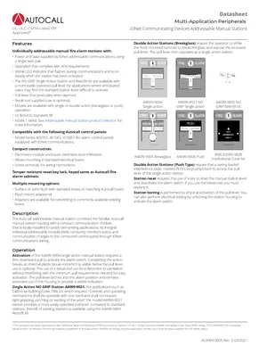 Datasheet for the Autocall IDNet Addressable Manual Stations, published in 2021. Document No: AC4099-0005, Rev: 5. 25 models including A4099-9004, A4099-9004CB, A4099-9004CF and 22 additional variants. Product features, environmental operating limits, and compatibility data.
