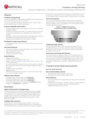 Datasheet for the Autocall TrueAlarm Analog Sensors, published in 2023. Document No: AC4098-0019, Rev: 33. 24 models including 4007ES, 4010ES, 4100ES and 21 additional variants. Product features, environmental operating limits, and compatibility data.