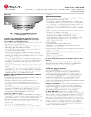Datasheet for the Autocall TrueAlarm CO Sensor Bases, published in 2015. Document No: AC4098-0052, Rev: 4. 10 models including A4098-9770, A4098-9771, A4098-9714 and 7 additional variants. Product features, environmental operating limits, and compatibility data.