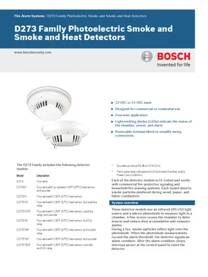 Datasheet for the Bosch D273 Family Smoke and Heat Detectors, published in 2014. Document No: 2700558987, Rev: V4. 14 models including D273, D273IS, D273TH and 11 additional variants. Product features, environmental operating limits, and compatibility data.