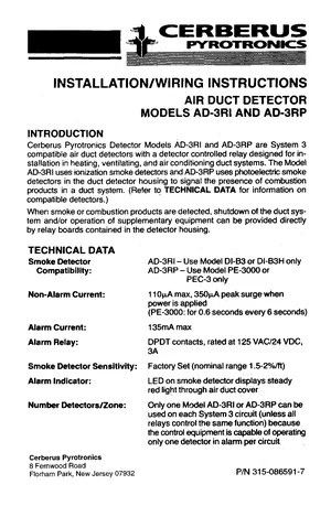 Installation and Operations Manual for the Cerberus Pyrotronics AD-3RI and AD-3RP. Document No: 315-086591-7, Rev: 7. 25 models including AD-3RI, AD-3RP, DI-B3 and 22 additional variants. Hardware mounting, wiring, and user system management.