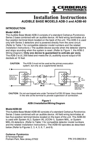 Installation Manual for the Cerberus Pyrotronics ADB-3 and ADBI-60. Document No: 315-086238-4. 27 models including ADB-3, ADBI-60, DB-3S and 24 additional variants. Physical installation guide, backbox dimensions, and cabling specifications.