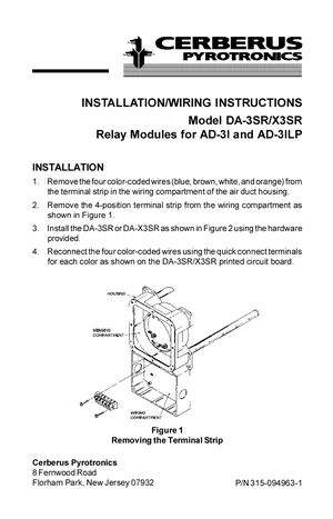 Installation Manual for the Cerberus Pyrotronics DA-3SR and DA-X3SR. Document No: 315-094963-1, Rev: 1. 11 models including DA-3SR, DA-X3SR, AD-3I and 8 additional variants. Physical installation guide, backbox dimensions, and cabling specifications.