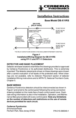 Installation Manual for the Cerberus Pyrotronics DB-X11RS. Document No: 315-096040-1. 4 models including DB-X11RS, FP-11, FPT-11 and 1 additional variants. Physical installation guide, backbox dimensions, and cabling specifications.