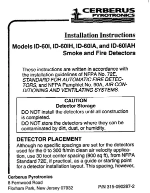 Installation Manual for the Cerberus Pyrotronics ID-60I, ID-60IH, ID-60IA, and ID-60IAH. Document No: 315-090287-2. 9 models including ID-60I, ID-60IH, ID-60IA and 6 additional variants. Physical installation guide, backbox dimensions, and cabling specifications.