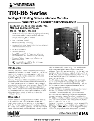 Datasheet for the Cerberus Pyrotronics TRI-B6 Series, published in 1997. Document No: 6168, Rev: 5/97. Models TRI-B6, TRI-B6R and TRI-B6D. Detailed technical specifications, electrical ratings, and agency listings.