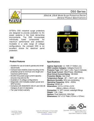 Datasheet for the DITEK D50 Series Surge Protective Device, published in 2011. Document No: SPS-100073-001, Rev: 2. 16 models including D50, D50-120/2401, D50-120/240HD and 13 additional variants. Detailed technical specifications, electrical ratings, and agency listings.
