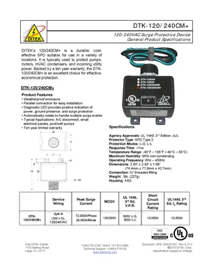 Datasheet for the DITEK DTK-120/240CM+, published in 2012. Document No: SPS-100024-001, Rev: 9. 4 models including DTK-120/240CM+, DTK-120HW, DTK-120GP and 1 additional variants. Product features, environmental operating limits, and compatibility data.