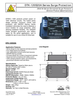 Datasheet for the DITEK DTK-120S20A Series Surge Protection, published in 2007. Document No: SPS-100048-001, Rev: 3. Models DTK-120S20A and DTK-120S15A. Product features, environmental operating limits, and compatibility data.