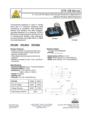 Datasheet for the DITEK DTK-DB Series Serial Protectors, published in 2007. Document No: SPS-100028-001, Rev: 2. Models DTK-DB9, DTK-DB15 and DTK-DB25. Product features, environmental operating limits, and compatibility data.