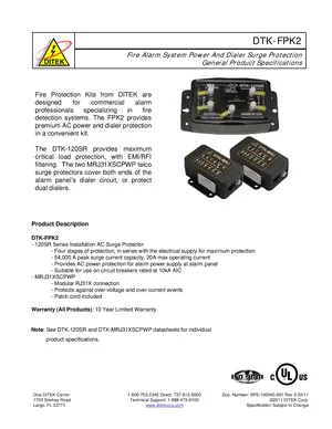 Datasheet for the DITEK DTK-FPK2, published in 2011. Document No: SPS-100040-001, Rev: 5. Models DTK-FPK2, DTK-120SR and MRJ31XSCPWP. Product features, environmental operating limits, and compatibility data.