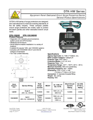 Datasheet for the DITEK DTK-HW Series Surge Protectors, published in 2011. Document No: SPS-100057-001, Rev: 9. Models DTK-120HW and DTK-120/240HW. Product features, environmental operating limits, and compatibility data.