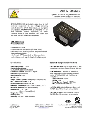 Datasheet for the DITEK DTK-MRJ45C5E, published in 2012. Document No: SPS-100042-003, Rev: 8. 5 models including DTK-MRJ45C5E, DTK-MRJ45C5EGP, DTK-MRJ45DSL and 2 additional variants. Engineering specifications, wiring diagrams, and mounting dimensions.