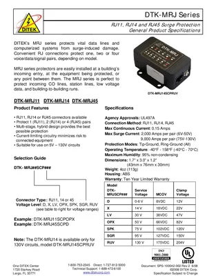 Datasheet for the DITEK DTK-MRJ Series, published in 2008. Document No: SPS-100042-002, Rev: 2. 6 models including DTK-MRJ11, DTK-MRJ14, DTK-MRJ45 and 3 additional variants. Engineering specifications, wiring diagrams, and mounting dimensions.