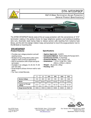 Datasheet for the DITEK DTK-MT25PSCP, published in 2008. Document No: SPS-100055-002, Rev: 2. Model DTK-MT25PSCP. Detailed technical specifications, electrical ratings, and agency listings.