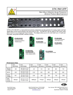 Datasheet for the DITEK DTK-RM12FP, published in 2011. Document No: SPS-100072-001, Rev: 2. 9 models including DTK-RM12FP, DTK-MRJ45C5EM, DTK-MRJ45M12 and 6 additional variants. Engineering specifications, wiring diagrams, and mounting dimensions.