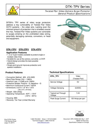 Datasheet for the DITEK DTK-TPV Series Surge Protectors, published in 2007. Document No: SPS-100063-001, Rev: 1. Models DTK-1TPV, DTK-2TPV and DTK-4TPV. Engineering specifications, wiring diagrams, and mounting dimensions.