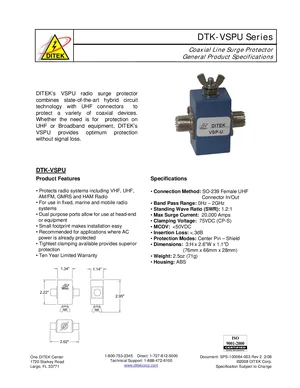 Datasheet for the DITEK DTK-VSPU Series Surge Protector, published in 2008. Document No: SPS-100064-003, Rev: 2. Models DTK-VSPU and VSP-U. Detailed technical specifications, electrical ratings, and agency listings.