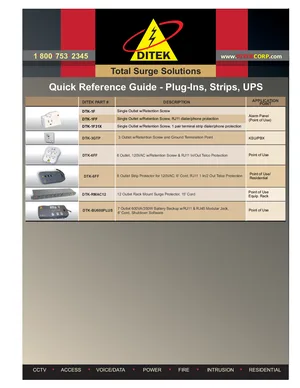 Quick Start for the DITEK Plug-Ins, Strips, UPS. 8 models including DTK-1F, DTK-1FF, DTK-1F31X and 5 additional variants. Rapid deployment guide, safety warnings, and initial testing.
