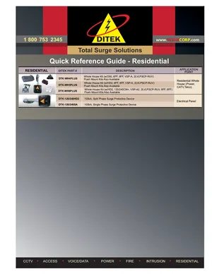 Quick Start for the DITEK Residential Surge Solutions. 5 models including DTK-WH4PLUS, DTK-WH5PLUS, DTK-WH8PLUS and 2 additional variants. Essential installation steps, basic configuration, and system power-up.