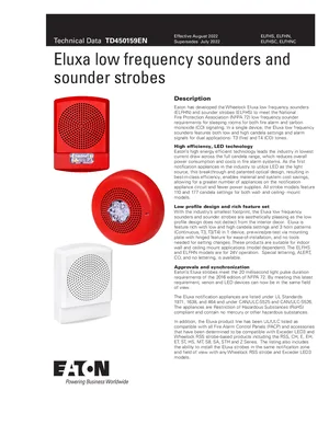 Datasheet for the Eaton Eluxa Low Frequency Sounders, published in 2022. Document No: TD450159EN. 4 models including ELFHS, ELFHN, ELFHSC and 1 additional variants. Product features, environmental operating limits, and compatibility data.
