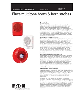 Datasheet for the Eaton Eluxa Multitone Horns and Strobes, published in 2023. Document No: TD450181EN. Models ELMT, ELMTS and ELMTSC. Detailed technical specifications, electrical ratings, and agency listings.