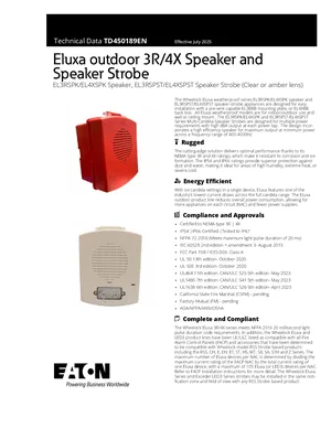 Datasheet for the Eaton Eluxa Outdoor 3R/4X Speakers, published in 2025. Document No: TD450189EN. 6 models including EL3RSPK, EL4XSPK, EL3RSPST and 3 additional variants. Engineering specifications, wiring diagrams, and mounting dimensions.
