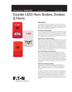 Datasheet for the Eaton Exceder LED3 Notification Appliances, published in 2017. Document No: TD450117EN. 24 models including LHN3, LHS3, LST3 and 21 additional variants. Product features, environmental operating limits, and compatibility data.