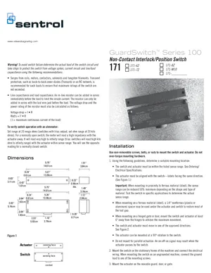 Installation Manual for the Edwards EST 100 Series GuardSwitch, published in 2013. Document No: P/N 11505, Rev: B. 5 models including 171-6Z, 171-7Z, 171-8Z and 2 additional variants. Physical installation guide, backbox dimensions, and cabling specifications.