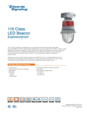 Datasheet for the Edwards EST 116 Class LED Beacon, published in 2012. Document No: ES001-2005, Rev: Issue 1. 14 models including 116EXMLEDA-Y6, 116EXMLEDB-Y6, 116EXMLEDW-Y6 and 11 additional variants. Product features, environmental operating limits, and compatibility data.