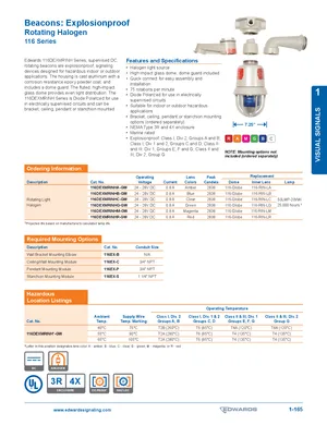 Manual for the Edwards EST 116 Series 24-28v Dc Rotating Halogen Catalog Page. 19 models including 116DEXMRINHA-GW, 116DEXMRINHB-GW, 116DEXMRINHC-GW and 16 additional variants. System overview, features and capabilities, and basic operation.