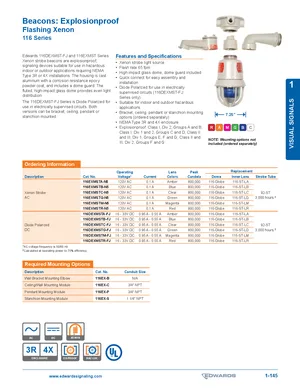 Manual for the Edwards EST 116 Series Flashing Xenon Catalog Page. 29 models including 116EXMSTA-N5, 116EXMSTB-N5, 116EXMSTC-N5 and 26 additional variants. Capabilities, specifications summary, and usage notes.