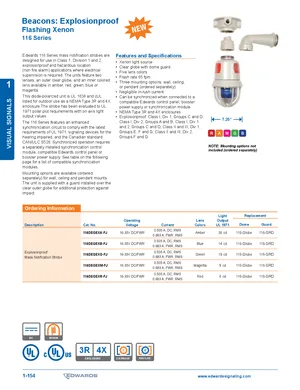 Datasheet for the Edwards EST 116 Series Mass Notification Xenon Strobe. 23 models including 116 Series, 116DEGEXA-FJ, 116DEGEXB-FJ and 20 additional variants. Product features, environmental operating limits, and compatibility data.
