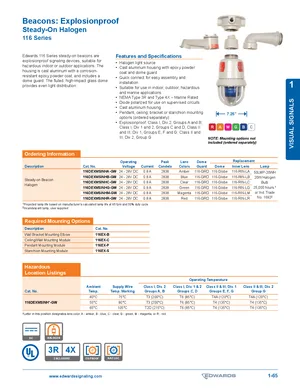 Datasheet for the Edwards EST 116 Series Explosionproof Beacons. 6 models including 116DEXMSINHA-GW, 116DEXMSINHB-GW, 116DEXMSINHC-GW and 3 additional variants. Product features, environmental operating limits, and compatibility data.