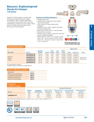 Datasheet for the Edwards EST 116 Series Explosionproof Beacons. 6 models including 116EXMSINHA-N5, 116EXMSINHB-N5, 116EXMSINHC-N5 and 3 additional variants. Product features, environmental operating limits, and compatibility data.
