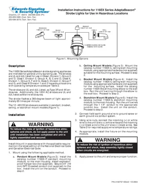 Installation Manual for the Edwards EST 116EX Series Strobes, published in 2004. Document No: 3100757, Rev: 1. 7 models including 116EX, 116EX-P, 116EX-C and 4 additional variants. Hardware installation, terminal connections, and environmental requirements.