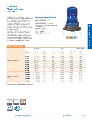 Datasheet for the Edwards EST 117 Class Flashing Xenon Beacons. 15 models including 117A-N5, 117B-N5, 117C-N5 and 12 additional variants. Engineering specifications, wiring diagrams, and mounting dimensions.