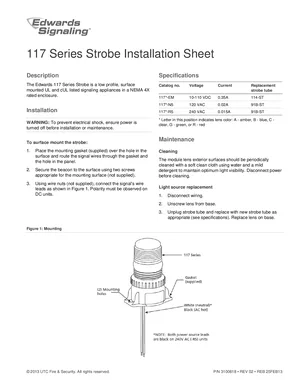 Installation Manual for the Edwards EST 117 Series Strobe, published in 2013. Document No: 3100818, Rev: 02. Models 117-EM, 117-N5 and 117-R5. Physical installation guide, backbox dimensions, and cabling specifications.