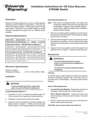 Installation Manual for the Edwards EST 125 Class Beacons, published in 2010. Document No: 3101651, Rev: 3. 8 models including 125STRH*120A, 125STRH*120AB, 125STRN*1248D and 5 additional variants. Physical installation guide, backbox dimensions, and cabling specifications.
