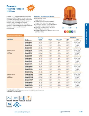 Datasheet for the Edwards EST 125 Class Flashing Halogen Beacons. 30 models including 125HALFA24A, 125HALFB24A, 125HALFC24A and 27 additional variants. Detailed technical specifications, electrical ratings, and agency listings.