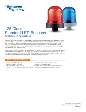 Datasheet for the Edwards EST 125 Class Standard LED Beacons, published in 2010. Document No: ES001-0107, Rev: 1. Models 125LEDF and 125LEDS. Product features, environmental operating limits, and compatibility data.