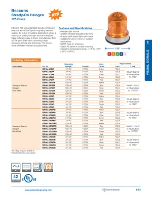 Datasheet for the Edwards EST 125 Class Steady-On Halogen Beacons. 30 models including 125HALSA24A, 125HALSB24A, 125HALSC24A and 27 additional variants. Product features, environmental operating limits, and compatibility data.