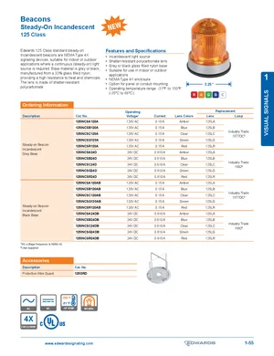 Datasheet for the Edwards EST 125 Class Steady-On Beacons. 20 models including 125INCSA120A, 125INCSB120A, 125INCSC120A and 17 additional variants. Detailed technical specifications, electrical ratings, and agency listings.