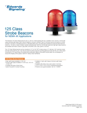 Datasheet for the Edwards EST 125 Class Strobe Beacons, published in 2010. Document No: ES001-0108, Rev: 1. 8 models including 125STRH*120A, 125STRH*120AB, 125STRN*1248D and 5 additional variants. Detailed technical specifications, electrical ratings, and agency listings.