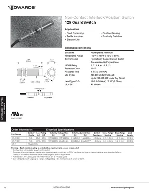 Datasheet for the Edwards EST 125 GuardSwitch. 5 models including 125-6Y-06K, 125-7Y-06K, 125-Y and 2 additional variants. Product features, environmental operating limits, and compatibility data.