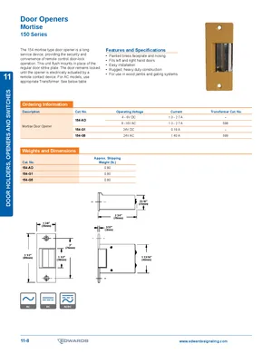 Datasheet for the Edwards EST 150 Series Mortise Door Openers. Models 154-AD, 154-G1 and 154-G5. Detailed technical specifications, electrical ratings, and agency listings.